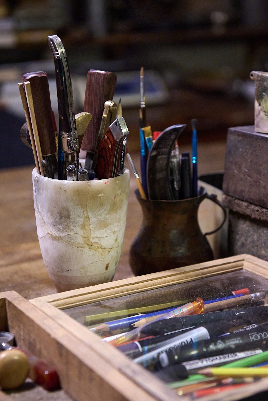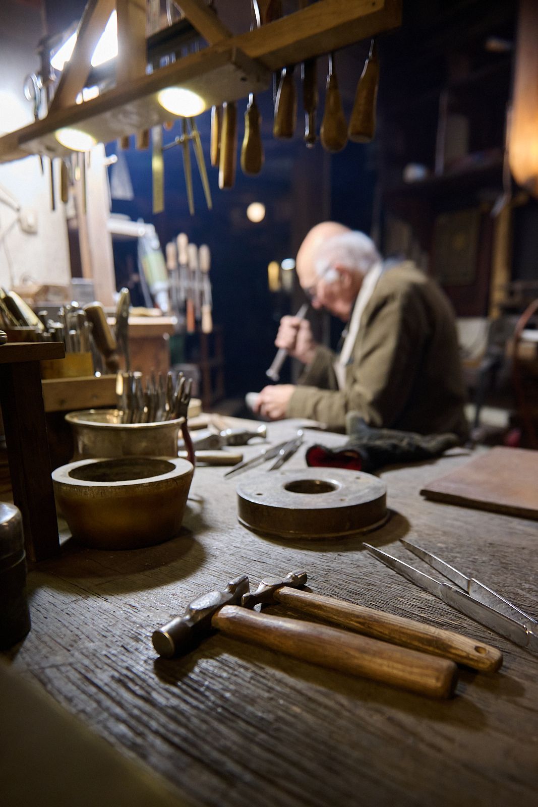 De tous les ateliers que j'ai pu voir celui de Goudji est celui qui m'a le plus impressionné. C'est un lieu chargé d'une atmosphère particulière et qui possède une âme évidente qui s'exprime dans un chaos de lumières, de matières et de souvenirs parfaitement organisés. Depuis son arrivé en France en 1974 Goudji travaille les pierres et métaux précieux, modèle l'argent à l'aide de marteaux et bigornes qu'il fabrique lui-même et n'est pas près de s'arrêter.